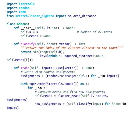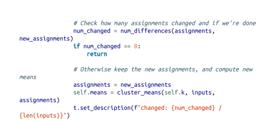 现在我们已经准备好编码我们的聚类算法了。像往常一样,我们将使用tqdm跟踪我们的进度,但这里我们不知道需要多少迭代,因此我们使用itertools.count,它创建无限迭代,并在完成后返回: