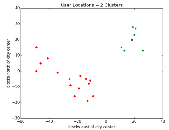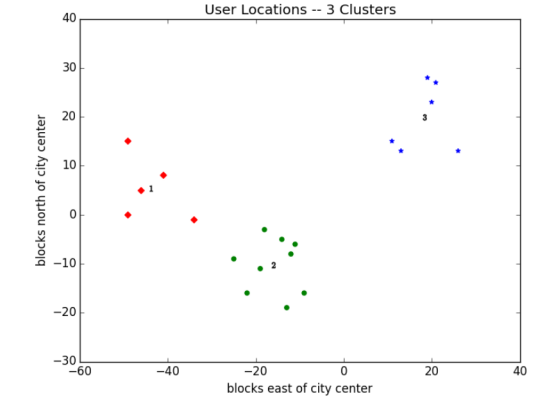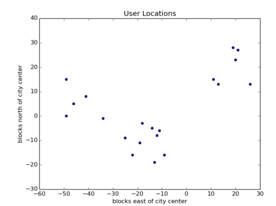 为了庆祝 DataSciencester 的发展壮大,用户回馈部门的副总决定针对你家乡的用户组织几场私人聚会,并赞助啤酒、披萨和 DataSciencester T 恤。由于你了解所有当地用户的住址(如图 20-1),所以他想让你来选择聚会的地点,以方便大家的参与。