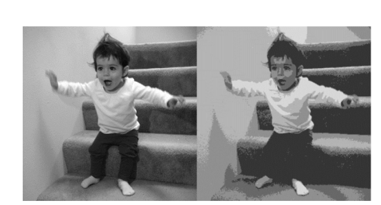 要在黑白书籍中很难显示颜色的结果,但图20-5显示了全彩色图片的灰度版本,以及使用此过程将其减少到五种颜色的输出。
