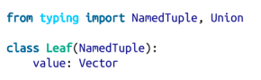 我们将使用一种非常简单的方法来表示聚类。首先,我们的数值向量将进入叶(leaf)聚类中,这时我们将其表示为NamedTuples: