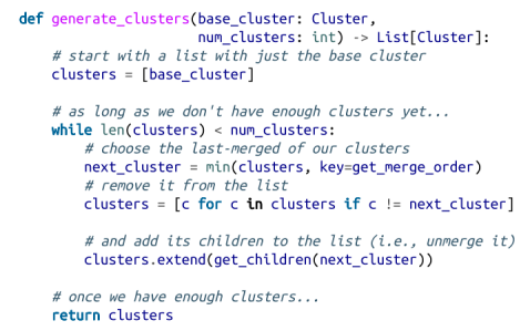 不过,一般来说,我们不想费眼睛看这样令人讨厌的文本表示。相反,让我们编写一个函数,通过执行适当数量的“逆合并”来生成任意数量的聚类: