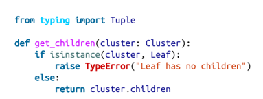 这是另一种Python的类型注释让我们失望的况。你希望将hintMerged.children键入Tuple[cluster,cluster],但mypy不允许使用这样的递归类型。