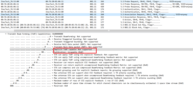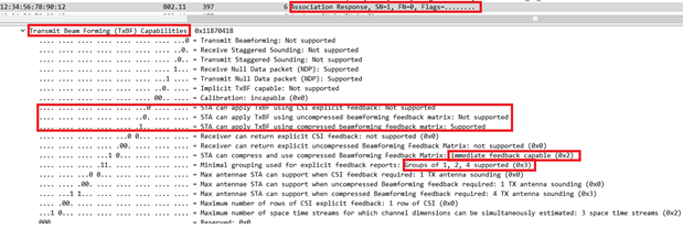 Association Response. HT Capabilities. Transmit Beam Forming (TxBF) Capabilities.STA can apply TxBF using compressed beamforming feedback matrix: Supported