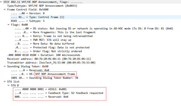- NDPA帧内容包含STA info field,如果其中只有单个STA信息则NDPA的RA域要设置为beamformee的MAC地址,否则RA设置为广播地址