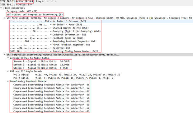 | Beamforming Feedback Matrix | 子载波的压缩波束赋形反馈矩阵,是否分组取决于Grouping (Ng) |