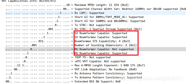 波束赋形能力可以在VHT Capabilities Information field里的SU Beamformer Capable、SU Beamformee Capable、MU Beamformer Capable、MU Beamformee Capable、 Beamformee STS Capability、Number of Sounding Dimensions等看到。