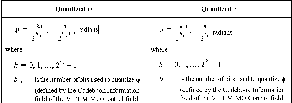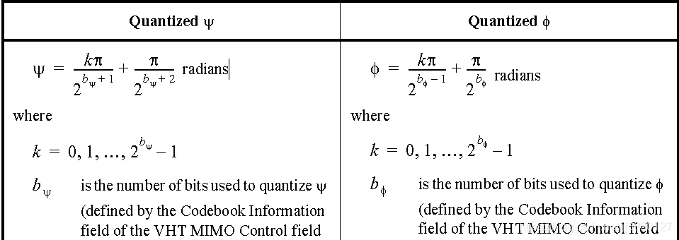 ,角度值ψ和ϕ记为ψ(k,u)和ϕ(k,u)按照上文量化。Beamformee生成反馈矩阵的行数必须等于NDP里的Nsts。