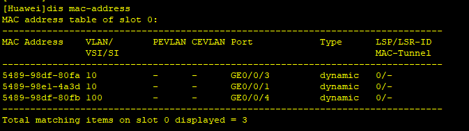 MAC地址表 字段: MAC address , VLAN(端口所属的vlan), Port(出端口), 。。。。。