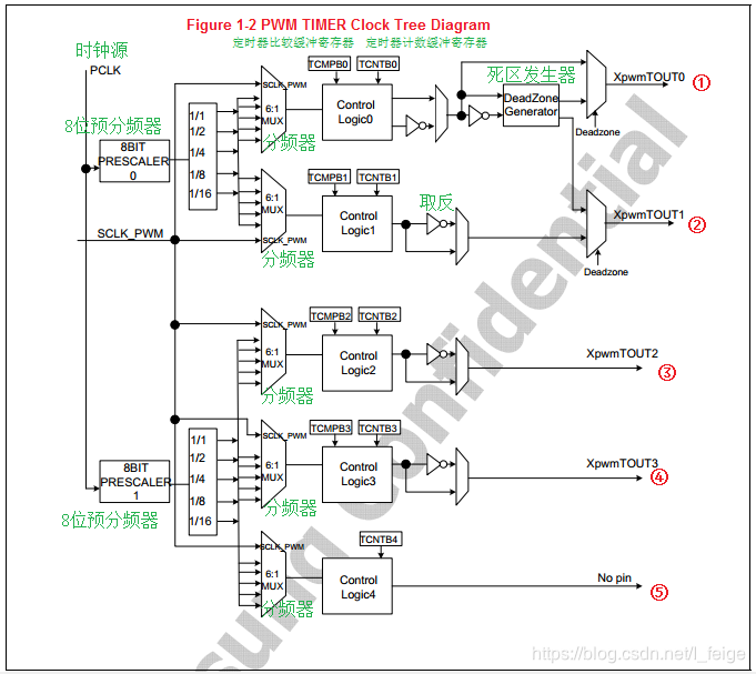 •两个8位时钟预分频器为PCLK提供第一级分频,五个时钟分频器和多路复用器为预分频器时钟和SCLK_PWM提供第二级除法