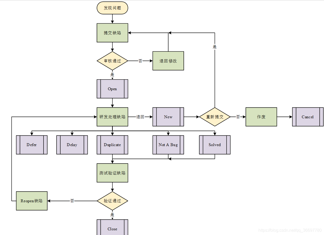 | Postponed(延期) | 有些时候,对于一些特殊的bug的测试需要搁置一段时间,事实上有很多原因可能导致这种情况的发生,比如无效的测试数据,一些特殊的无效的功能等等,在这种情况下,bug的状态就被设置为“Postponed“ |