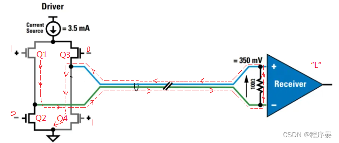 当Q2、Q3截止,而Q1、Q4导通时,恒流源电流经Q1向右流向接收器,并向上穿过100ohm端接电阻再返回至驱动端,最后经Q4到地(GND),3.5mA的电流在100ohm电阻也产生350mV的压降,但此时同相端电压低于反相端电压,输出为低电平“L”,如图所示: