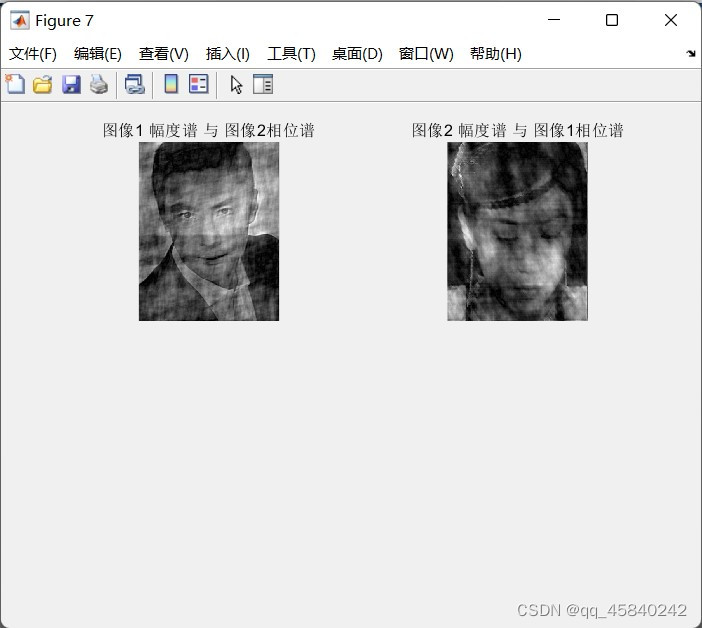 subplot(2,2,2),imshow(jJ,[]);title('图像2 幅度谱 与 图像1相位谱');