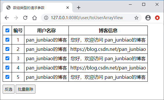 【示例】实现批量删除功能,在HTML页面中通过复选框选择一个或者多个用户信息,并提交到后台,后台Controller控制器中的方法获取数组类型的请求参数。