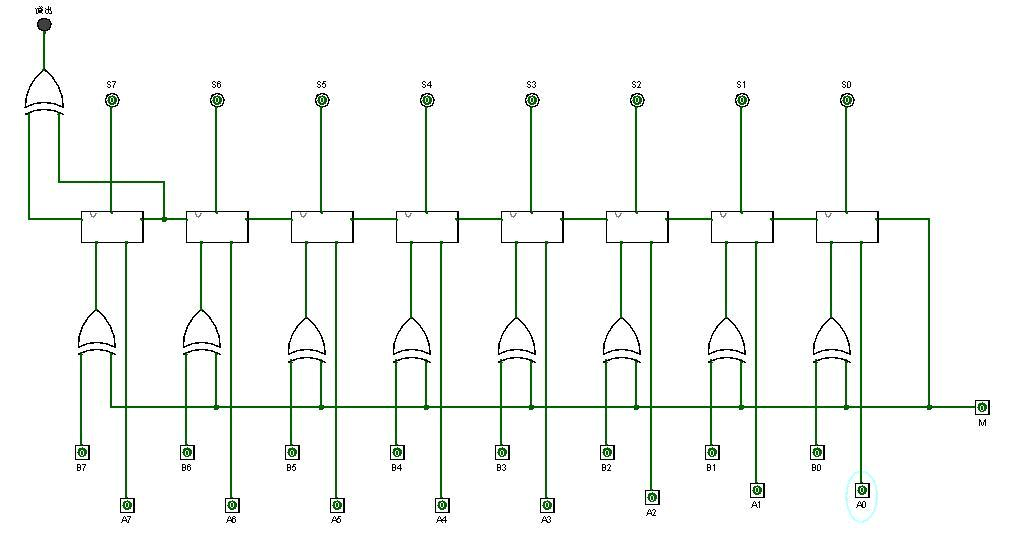 加减法电路是由加法电路改进得到的,在加法电路中Bi直接连接到全加器的B端上,而加减法电路在Bi与B之间加了一个异或门,异或门的另一个输入便是高电平有效的减法信号M。