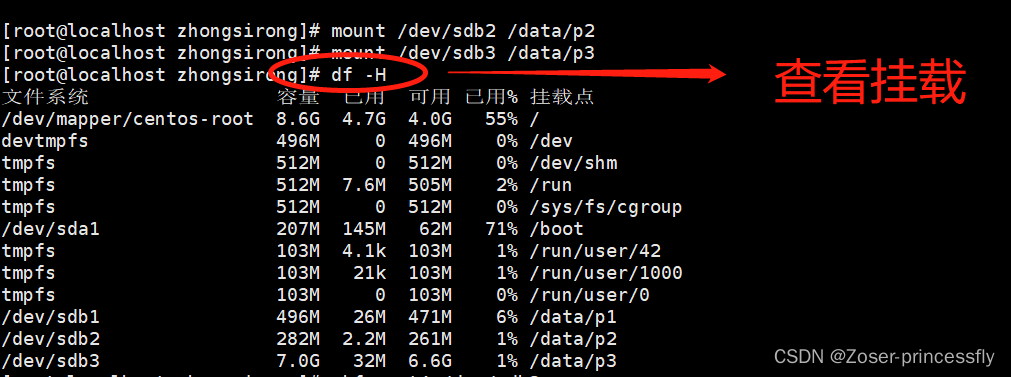 ②接着我继续格式化sdb2和sdb3,格式完后进行挂载使用,如下所示: