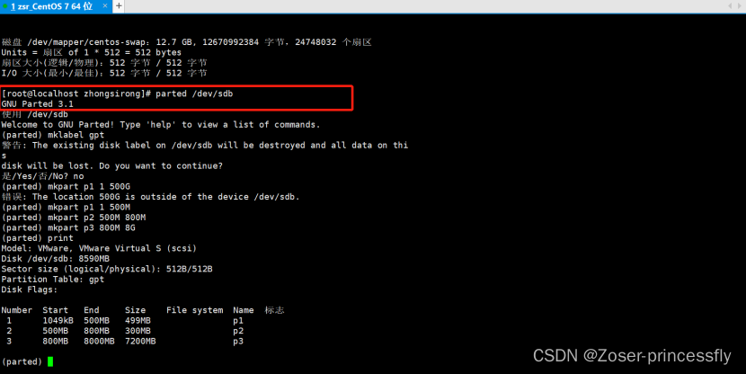 [root@localhost zhongsirong]# parted /dev/sdb #进入parted命令后并使用/dev/sdb硬盘