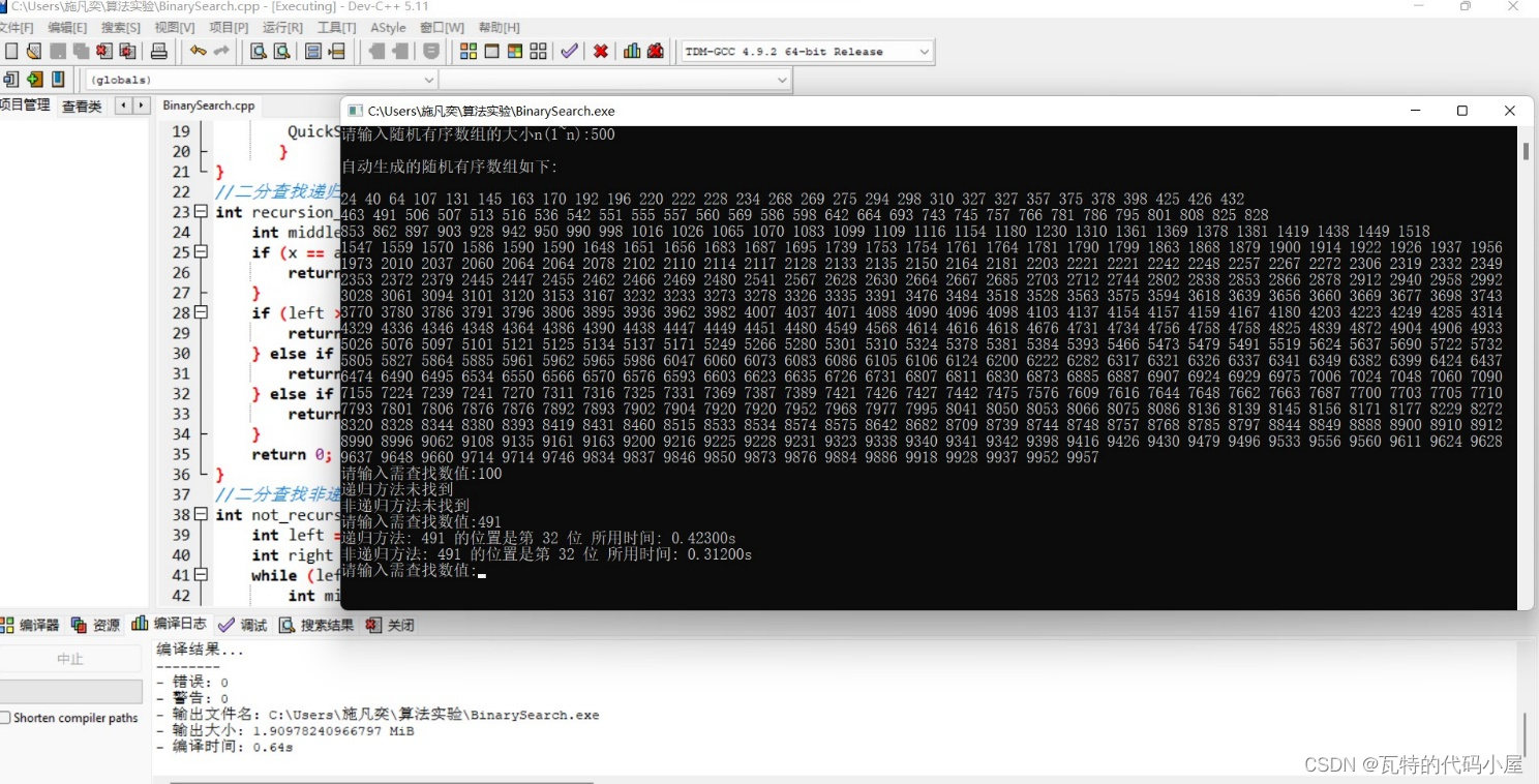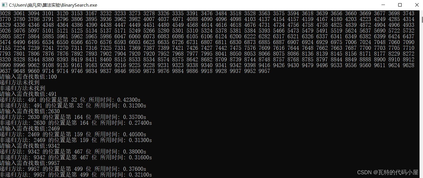 二分查找的递归与非递归程序,跟踪分析执行时间,分析两种算法的复杂性。