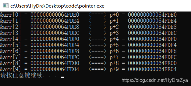 {int arr[10] = {0};int *p = arr;int i = 0;for(i = 0; i < 10; i++){printf("&arr[%d] = %p <====> p+%d = %p\n", i, &arr[i], i, p+i));}return 0;