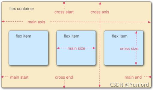 项目默认沿主轴排列。单个项目占据的主轴空间叫做main size,占据的交叉轴空间叫做cross size。