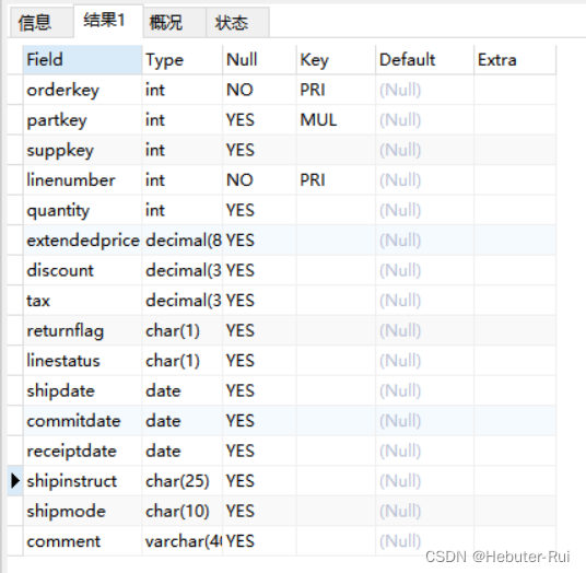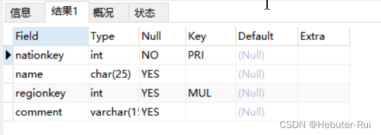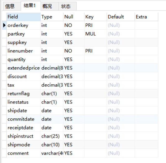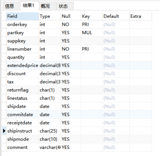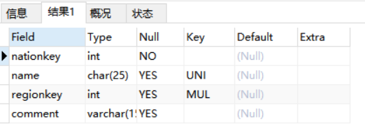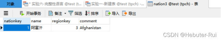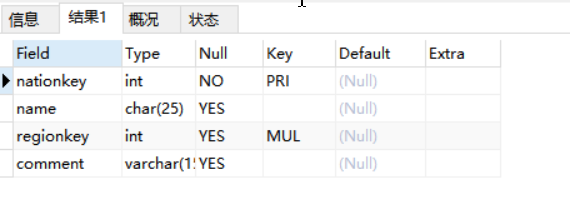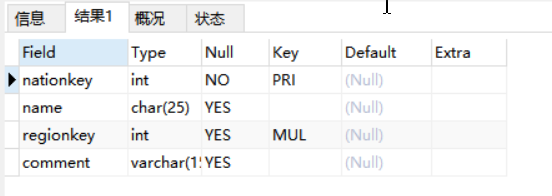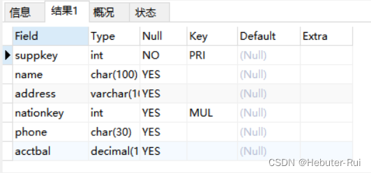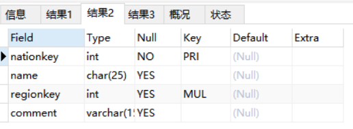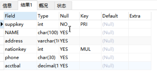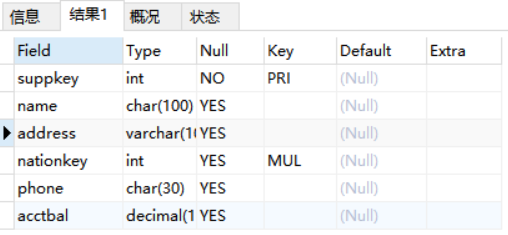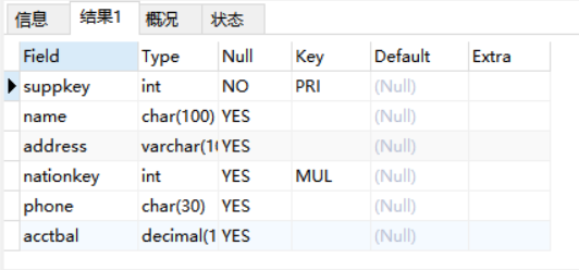 CREATE TABLE supplier2(suppkey INT,name CHAR(100),address VARCHAR(100),nationkey INT,phone CHAR(30),acctbal NUMERIC(12,2),comment VARCHAR(100),PRIMARY KEY(suppkey), #表级完整性FOREIGN KEY(nationkey) REFERENCES nation(nationkey)