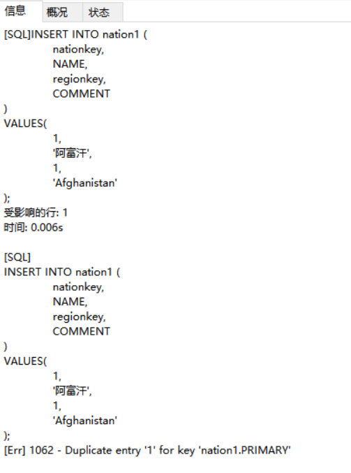 (6)给国家表(nation1)增加两条相同记录,验证实体完整性是否起作用。
