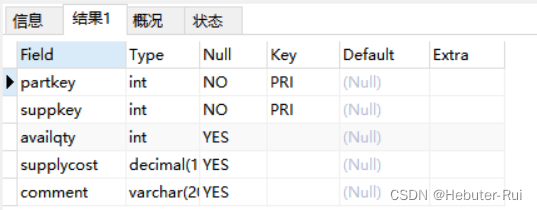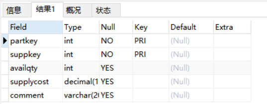 CREATE TABLE partsupp1(partkey INT,suppkey INT,availqty INT,supplycost NUMERIC(10,2),comment VARCHAR(200),PRIMARY KEY(partkey,suppkey), #表级完整性FOREIGN KEY(partkey) REFERENCES part(partkey),FOREIGN KEY(suppkey) REFERENCES supplier(suppkey)