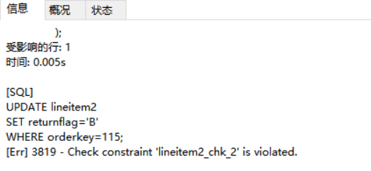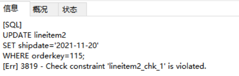 修改 Lineitem2 的一条记录,验证是否违反 CHECK 约束。
