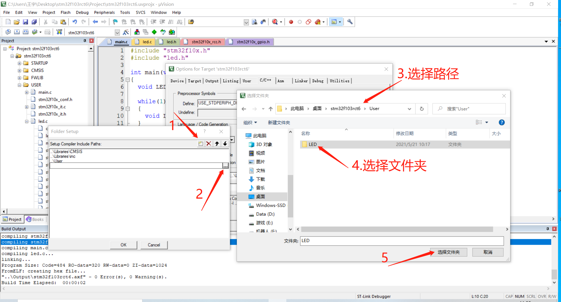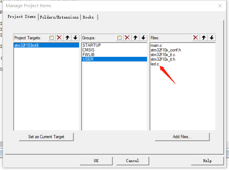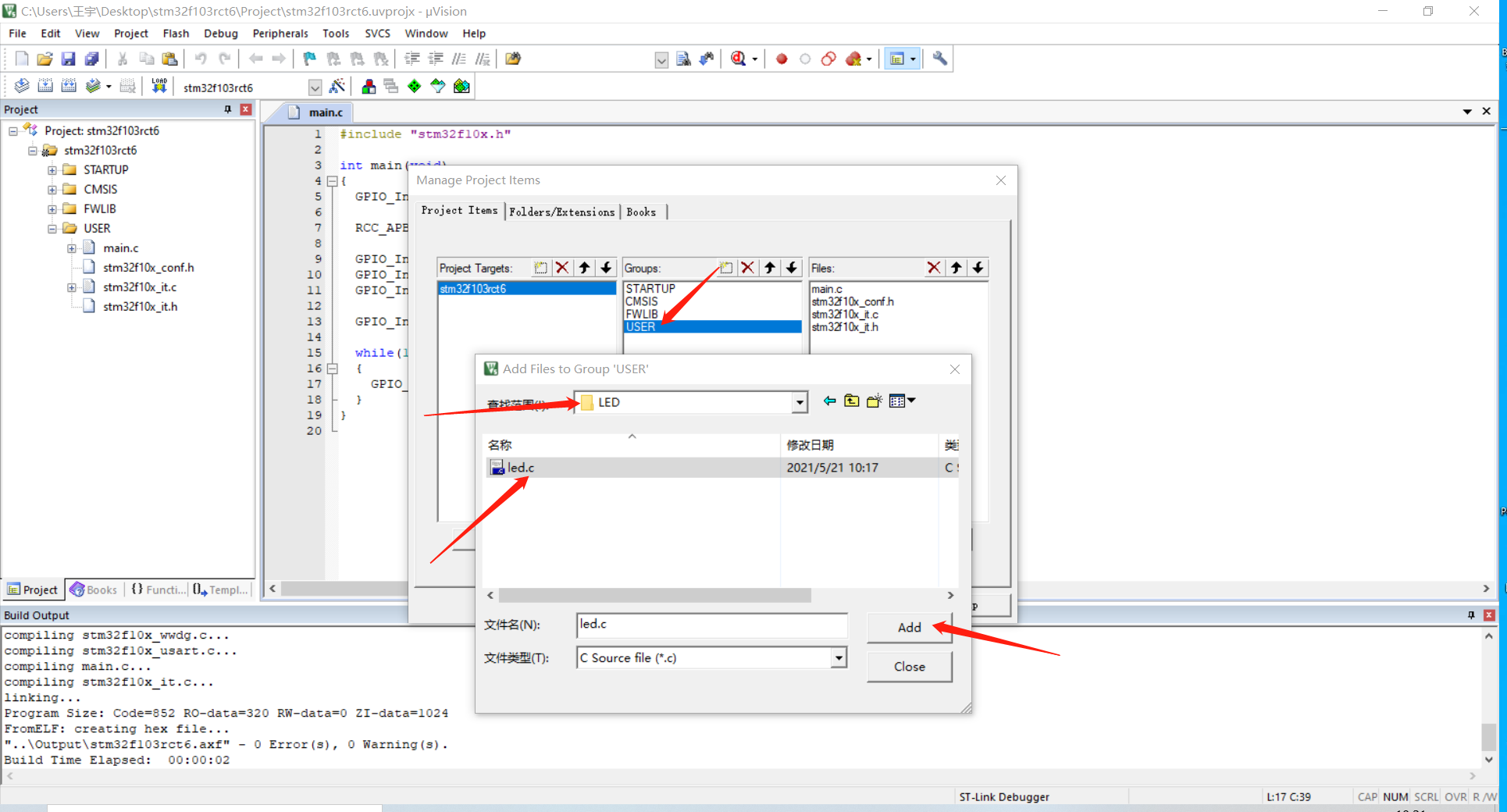 ( 1 )打开工程,点击品字符,选中USER文件夹,点击Add Files...,依照刚刚新建好的库函数文件夹的路径,找到新建的源文件(led.c),选中并点击Add添加。流程如图: