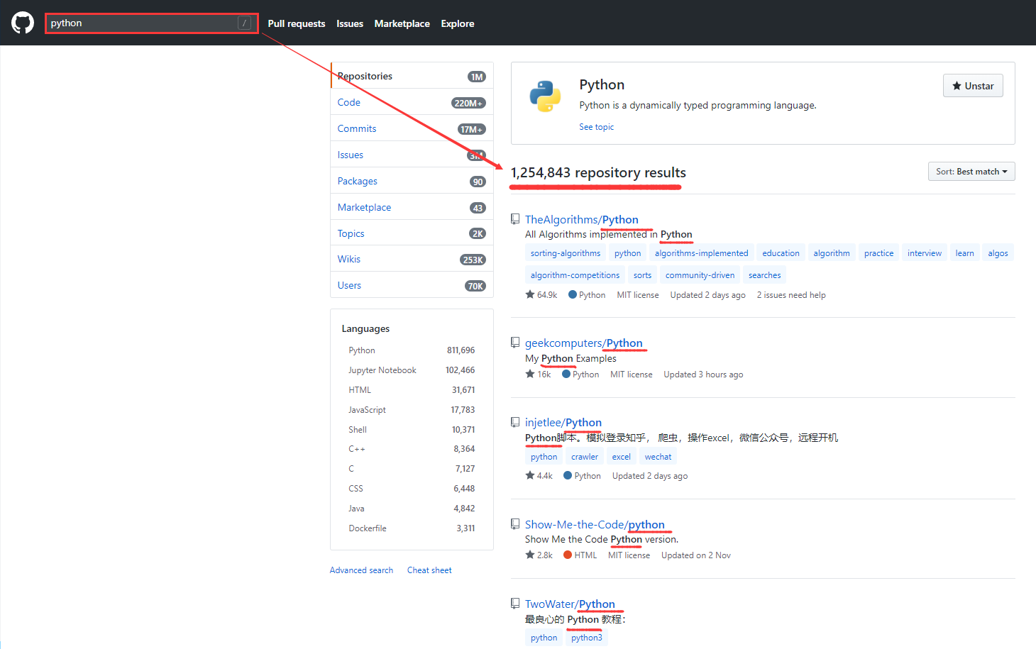 in:description | in:name,description python 查出仓库名或者项目描述中有 python 的项目 |