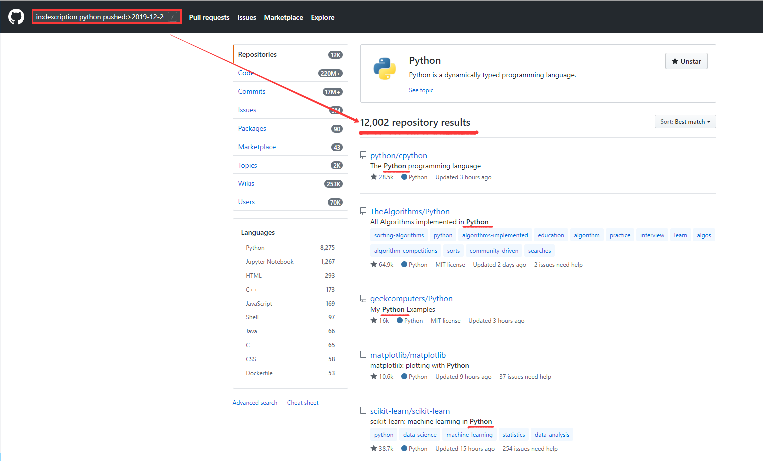 搜索 github 中,项目描述(description)中有 python 并且 2019-12-20 号之后有更新过的项目