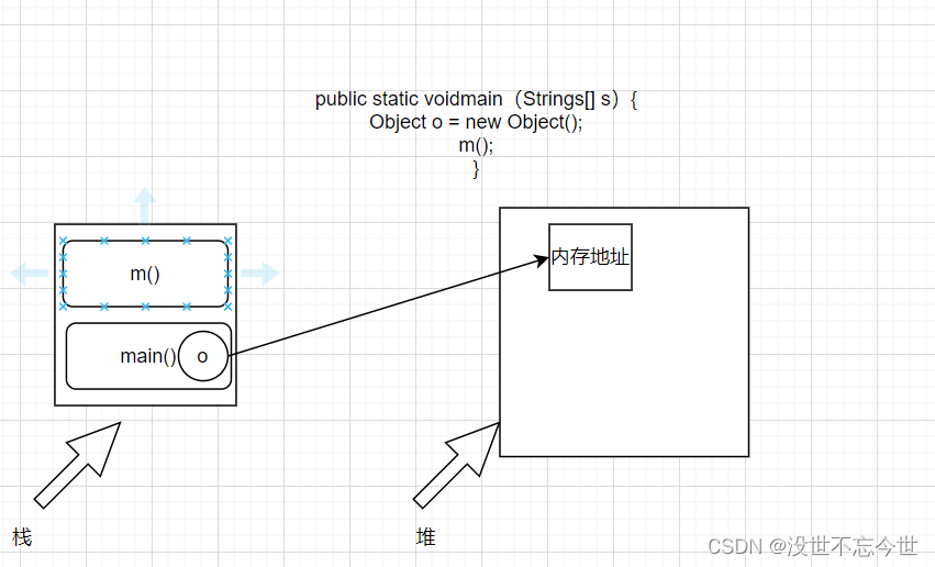 如图,我们程序中每个线程都会放在JVM的方法栈中,每一个线程相当于一个栈帧,当我们线程去new一个对象时,会向JVM堆中指向一块内存对象,当我们线程方法执行完后,会弹出方法栈,对象的指向也会释放掉,因此,程序中有很多这样的对象指向,当执行完后,对象不需要了释放,这些内存地址不回收的话,占用大量内存,因此java提供了GC来回收这些内存。