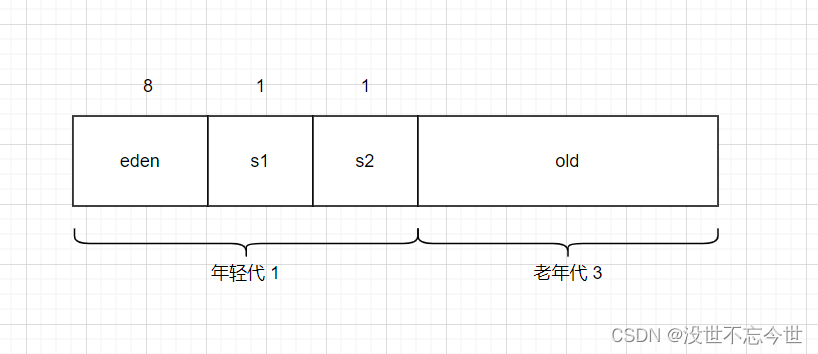 如图,分代回收的区域占比,其中年轻代和老年代1:3,年轻代中又分为比列:eden:s1:s1=8:1:1,新建对象在年轻代eden,然后经过一次gc,保留下来的放在s1,然后下一次新建的对象和s1一起gc,然后一起放到s2,其他的就清空,s1和s2切换,相当于复制回收,当对象gc过后十五次就可以进入老年代了,当老年代满了之后,内存发生溢出,这个时候老年代再进行full-gc。