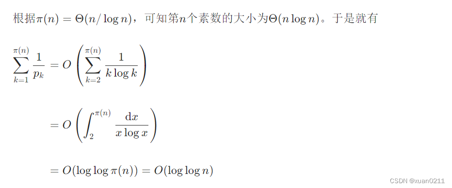 所以 Eratosthenes 筛法 的时间复杂度为O(nloglogn)
