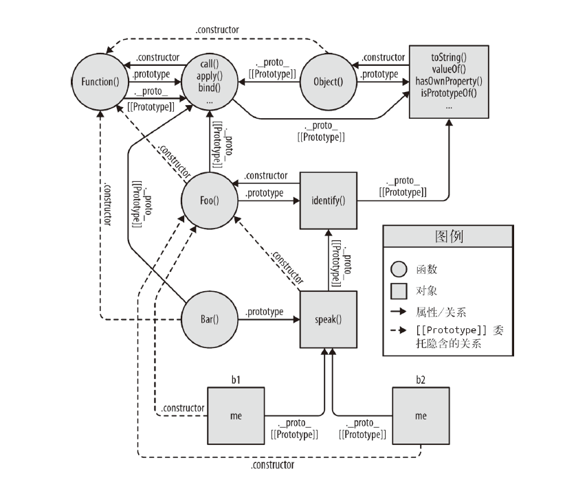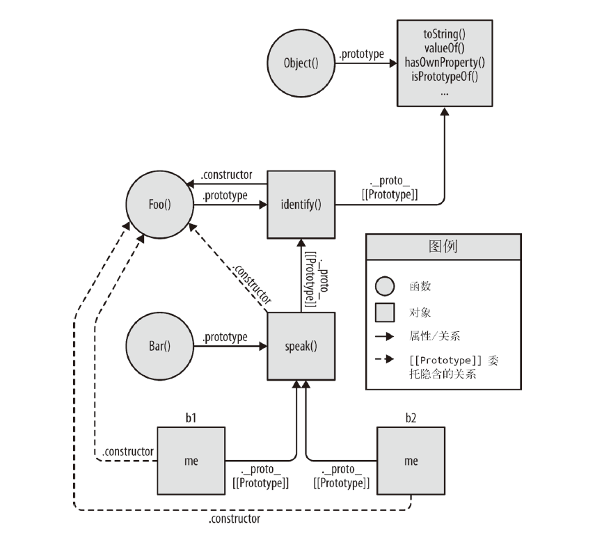function Foo(who) {this.me = who;}Foo.prototype.identify = function() {return "I am " + this.me;};function Bar(who) {Foo.call( this, who );}Bar.prototype = Object.create( Foo.prototype );Bar.prototype.speak = function() {alert( "Hello, " + this.identify() + "." );};var b1 = new Bar( "b1" );var b2 = new Bar( "b2" );b1.speak();b2.speak();