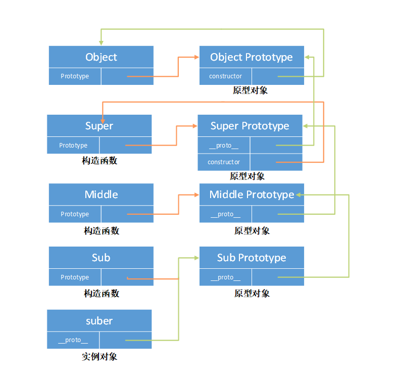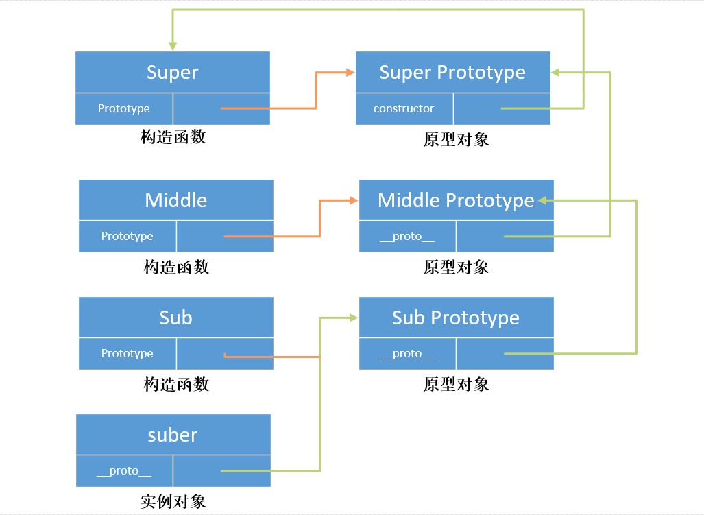 function Super(){};function Middle(){};function Sub(){};Middle.prototype = new Super();Sub.prototype = new Middle();var suber = new Sub();