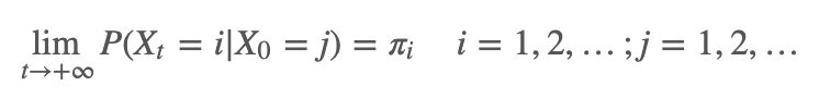 其中,不可约和正常返大家请自行查阅相关定义。直观上可以理解为,任何两个状态都是连通的,即从任意一个状态跳转到其它任意状态的概率值大于零。