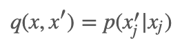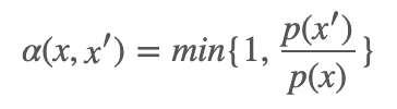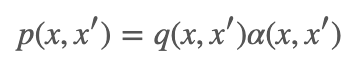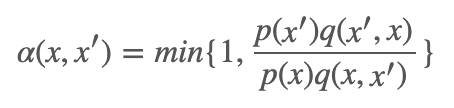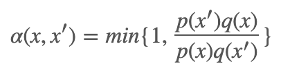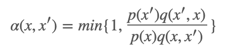 其中 q(x,x’) 是另一个卡尔科夫链的转移核,并且是一个容易抽样的分布,被称之为建议分布。而 α(x,x′) 被称为接受分布: