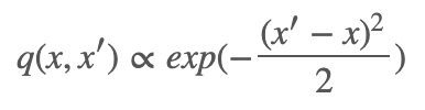 读者也很容易发现,当正态分布的方差为常数,均值为 x,参数为 x′ 的这些转移核都满足这种类型。这种类型的转移核的特点是,当 x′ 在均值 x 附近的时候,其概率也就越高。