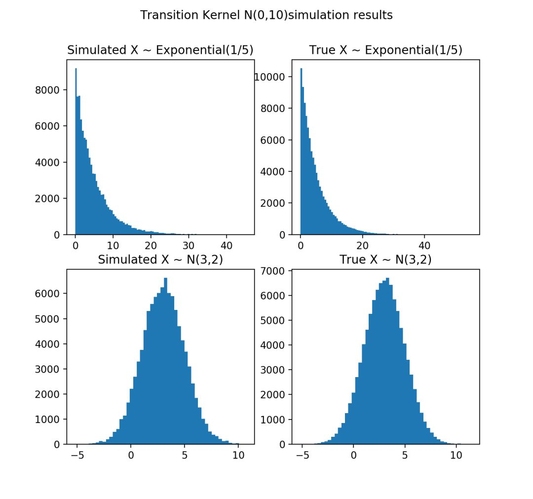 plt.title("True X ~ N(3,2)")plt.suptitle("Transition Kernel N(0,10)simulation results")