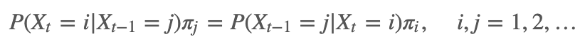 但是,要怎么确定平稳分布 π(我们希望采样的复杂分布)的马尔科夫链状态转移矩阵或者转移核 P 呢?在开始 MCMC 采样之前我们还需要回顾两个知识点: 可逆马尔科夫链和平衡细致方程。