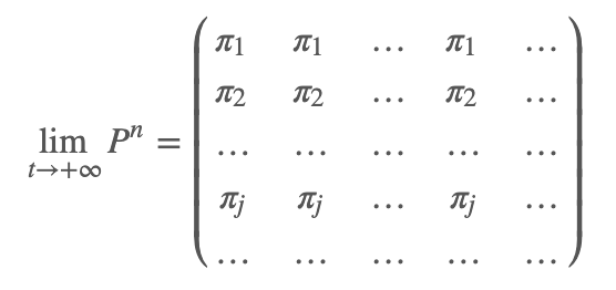 注意:这里的 表示的是第 j 个状态转移到第 i 个状态的概率。也就是说每一列表示这个状态转移到其它状态的概率。我们可以理解为,当时间趋于无穷时,马尔科夫链的状态分布趋近于平稳分布。另外,无论初始的分布 π′ 是什么,经过了 n 次转移后,即