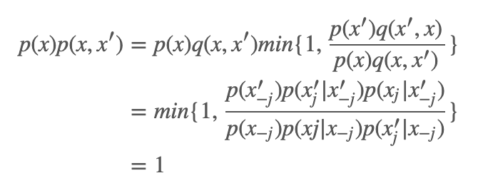 证明略。其实我们只要能证明这个构造出来的转移核 p(x,x′) 对应的马尔科夫链是可逆的,并且其对应的平稳分布就是 π 即可。也就是说需要证明: