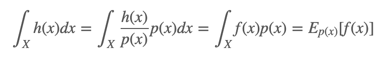 我们将 h(x) 分解成一个函数 f(x) 和一个概率密度函数 p(x) 的乘积,进而又将问题转换为求解函数 f(x) 关于密度函数 p(x) 的数学期望 :