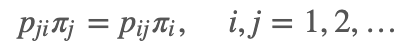 定理:满足细致平衡方程的状态分布 π 就是该马尔科夫链的平稳分布,即 Pπ=π。