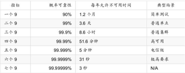 通常,单点的服务器系统至少应能满足两个9;普通企业信息系统三个9就足够;系统能达到四个9已经是领先水平(参考AWS等云计算平台);电信级的应用一般需要能达到五个9,一年里面最多允许出现五分钟左右的服务不可用;六个9以及以上的系统较为少见,要实现往往意味着极高的代价。