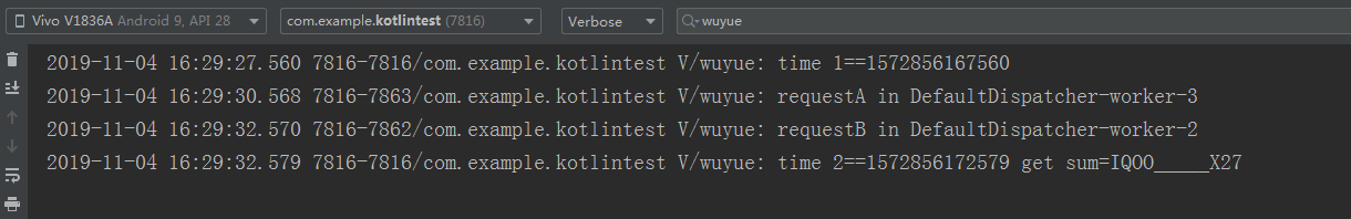 class MainActivity : AppCompatActivity() {override fun onCreate(savedInstanceState: Bundle?) {super.onCreate(savedInstanceState)setContentView(R.layout.activity_main)GlobalScope.launch(Dispatchers.Main) {Log.v("wuyue", "time 1==" + System.currentTimeMillis())val sum = withContext(Dispatchers.IO) {val requestA = async { requestA() }val requestB = async { requestB() }requestA.await() +"_____" +requestB.await()}Log.v("wuyue", "time 2==" + System.currentTimeMillis() + " get sum=" + sum)}}/*** 3s以后 才拿到请求结果 IQOO*/fun requestA(): String {sleep(3 * 1000)Log.v("wuyue", "requestA in " + Thread.currentThread().name)return "IQOO"}/*** 5秒以后拿到请求结果 B*/fun requestB(): String {sleep(5 * 1000)Log.v("wuyue", "requestB in " + Thread.currentThread().name)return "X27"}} 可以看出来,我们的2个请求分别在不一样的Thread中完成,并且回调到主线程的时机也差不多花了5s的时间,证明这2个request是并行请求的。