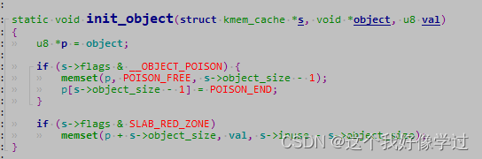 {u8 *p = object;if (s->flags & SLAB_RED_ZONE)memset(p - s->red_left_pad, val, s->red_left_pad);if (s->flags & __OBJECT_POISON) {memset(p, POISON_FREE, s->object_size - 1);p[s->object_size - 1] = POISON_END;}if (s->flags & SLAB_RED_ZONE)memset(p + s->object_size, val, s->inuse - s->object_size);