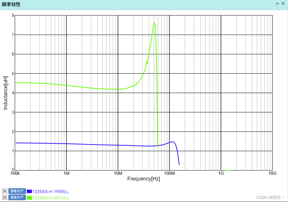 实际使用中,当工作频率小于谐振频率时,电感值基本保持稳定;工作频率超过谐振频率后,电感值会先增大,达到一定频率后,将会迅速减小。图3.1是muRata官网提供的电感值与工作频率特性曲线(这是一个链接),绿色曲线是4.7uH的电感,蓝色曲线是1.5uH电感。