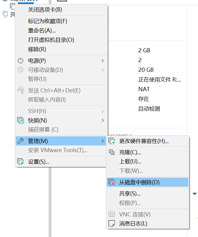 其实这样并没有删除虚拟机,只是把虚拟机从列表中移除而已。真正要把虚拟机从内存中删除,需要选择 管理 中的 从磁盘中删除。