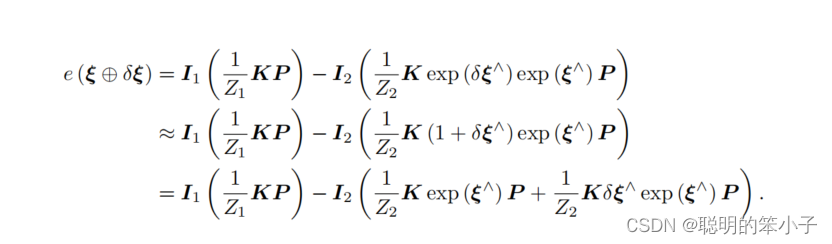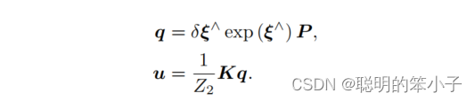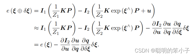 可以发现这里的其实就是P点经左扰动位于第二个相机坐标系下的坐标。而u则是q对应的像素坐标坐标。对式子进行一阶泰勒展开,有: